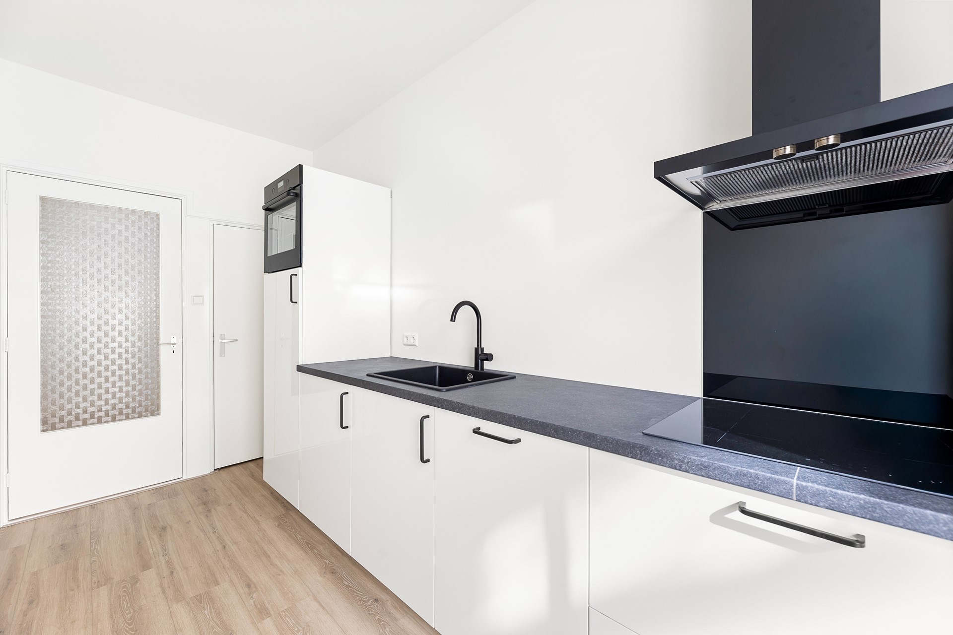 ruime overloop, nieuwe keuken met onder- en bovenkasten, diverse inbouwapparatuur, praktische lades en een vaste kast met opstelling c.v.-combiketel. Lichte woonkamer (ca. 29 m²) met laminaatvloer, vaste kast en ramen met roedeverdeling. Nette badkamer met ligbad en douche ineen, wastafelmeubel, toilet en wasmachine-aansluiting.