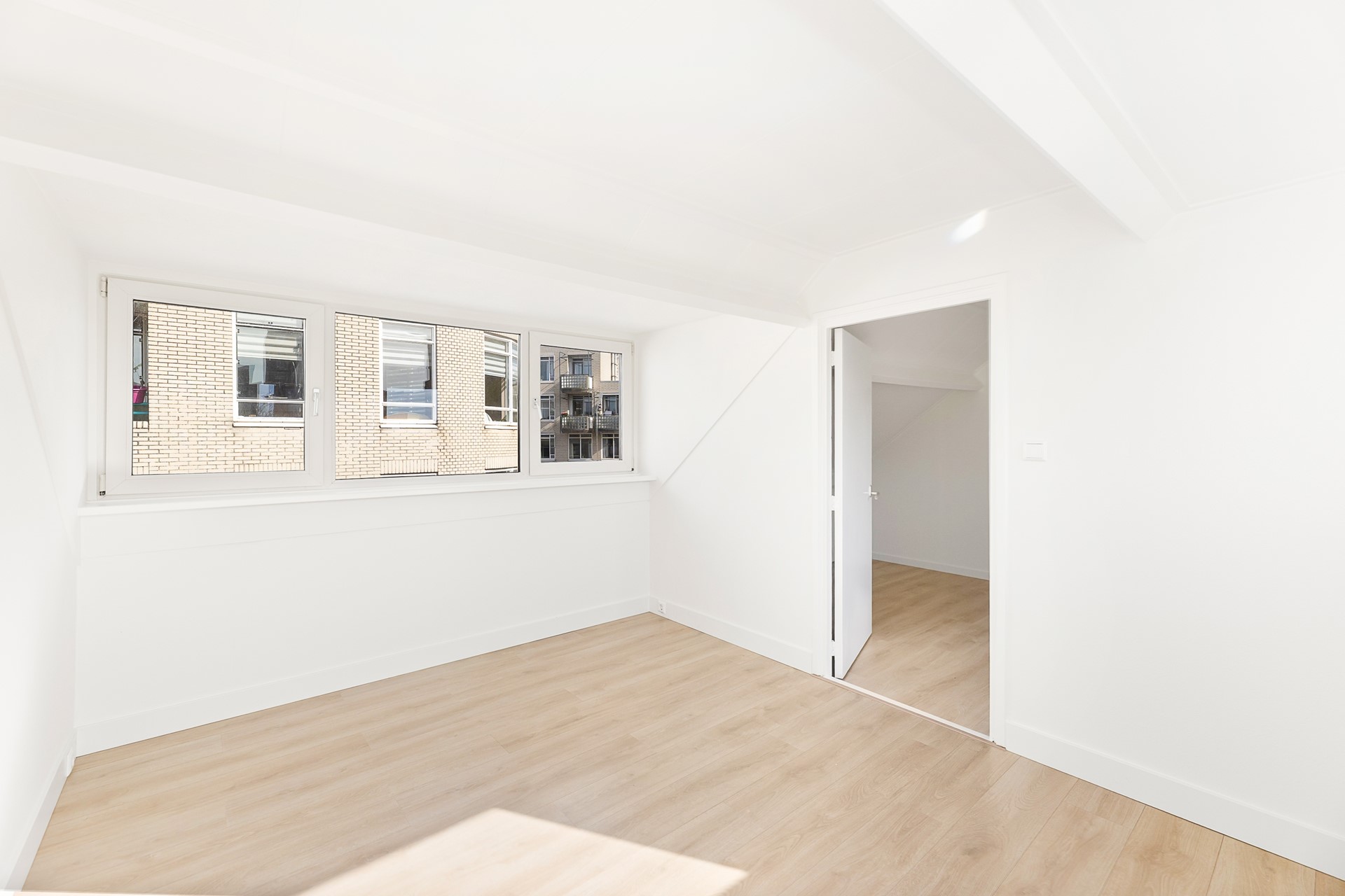 ruime overloop met toegang naar het zonnige balkon (ca. 4,4 m²) gelegen op het zuidoosten. Er bevinden zich op deze verdieping twee slaapkamers (ca. 8 m²), waarvan één kamer een doorloopkamer betreft naar de volgende slaapkamer. Tevens is er op deze verdieping bergruimte achter de knieschotten.