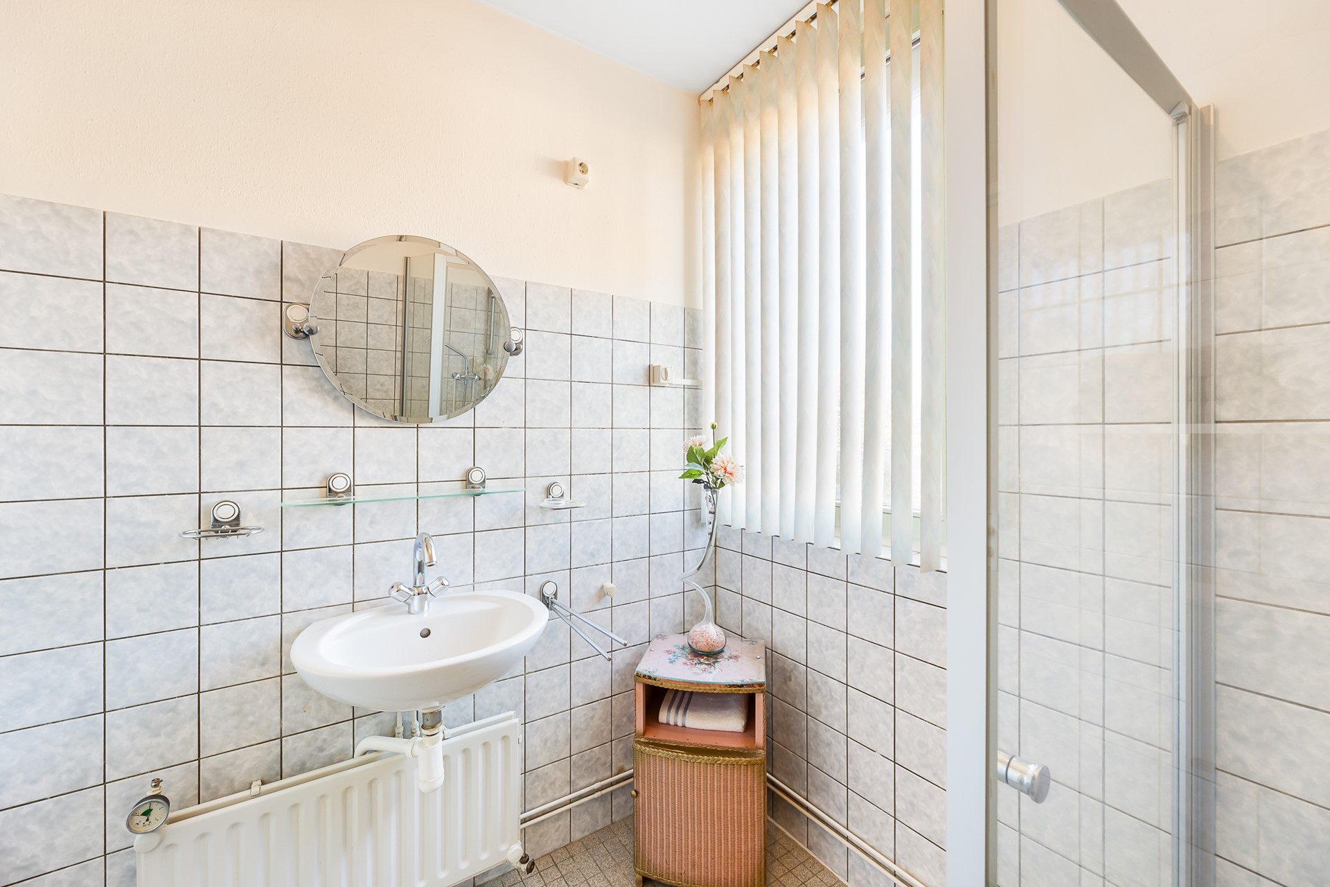 overloop, 3 slaapkamers (ca. 7 m², ca. 12 m² en ca. 15 m²). De badkamer is voorzien van inloopdouche, toilet en een wastafel.